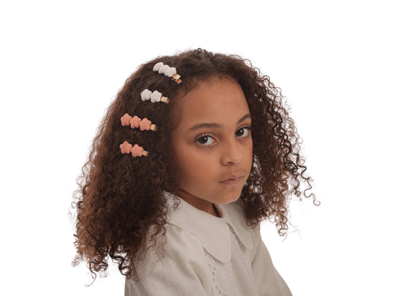 This little hairpin is an endearing solution for keeping baby's hair neatly in place. Clip is made of durable metal with fabric flowers.