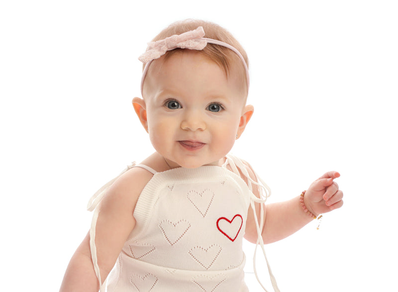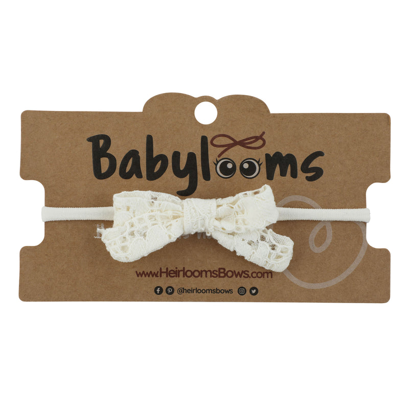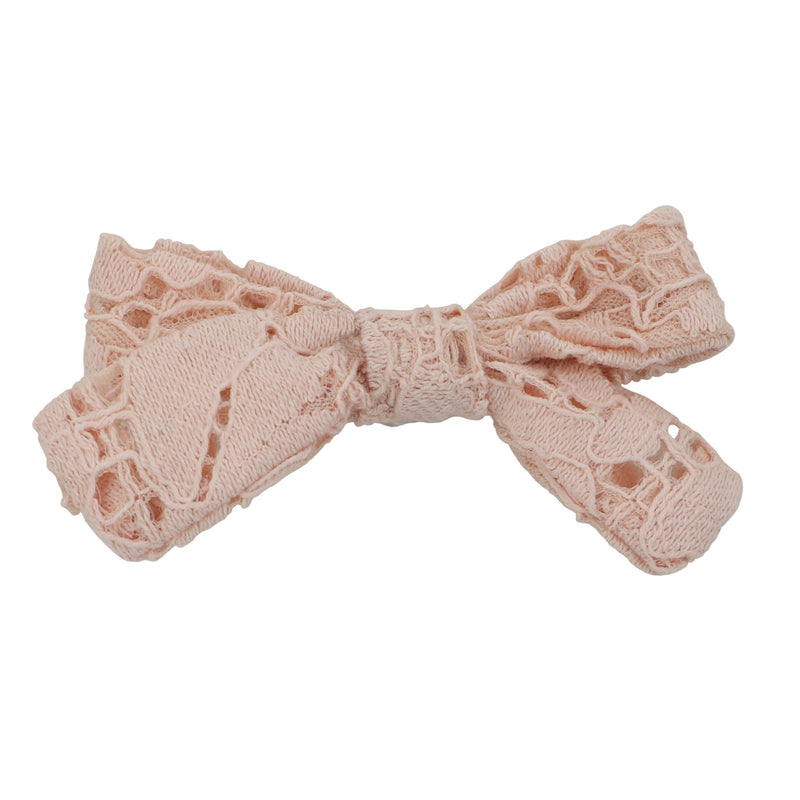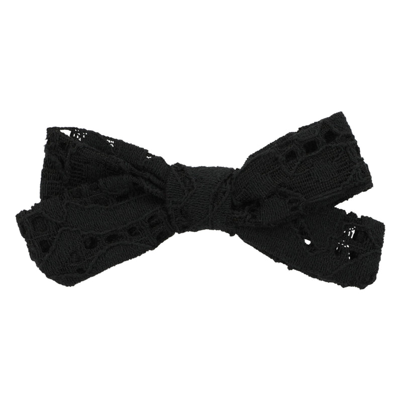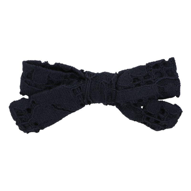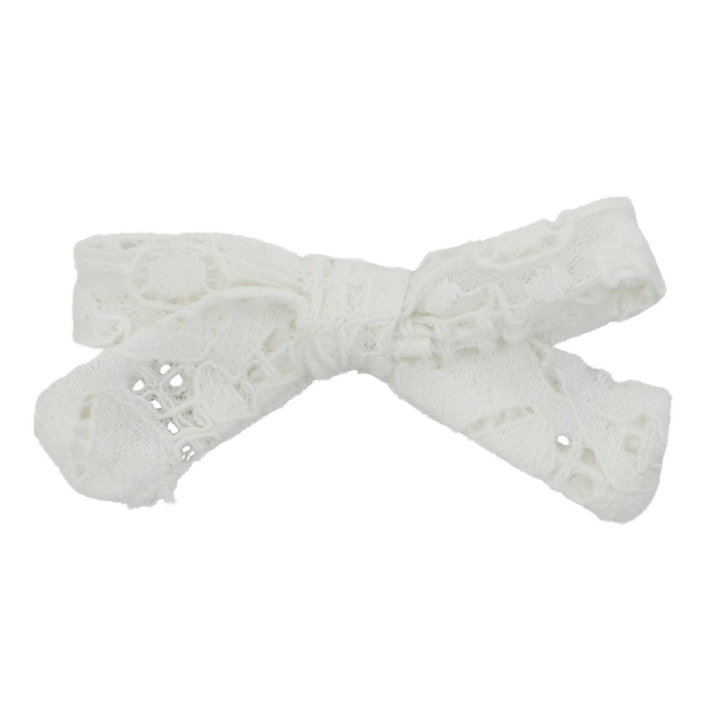 soft, intricate eyelet fabric, featuring a lattice-like pattern of holes that create a whimsical effect. bow is attached to a soft elastic.