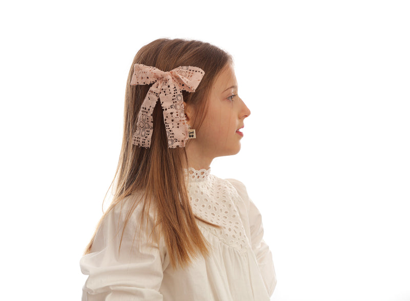 soft, intricate eyelet fabric, featuring a lattice-like pattern of holes that create a whimsical effect