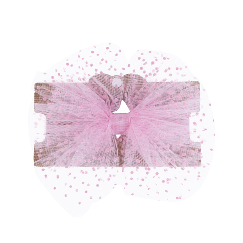 This fluffy pink tulle bow is the perfect girly addition for every little princess. attached to a soft rubber for a comfortable fit.