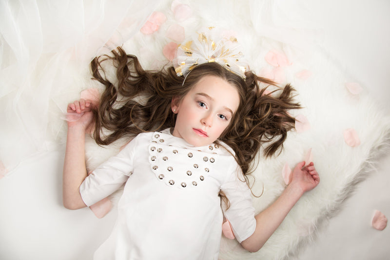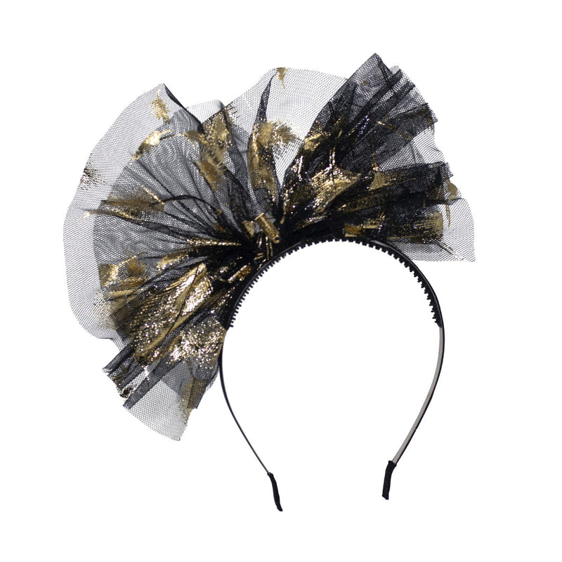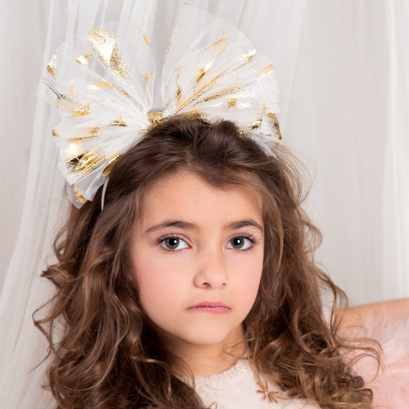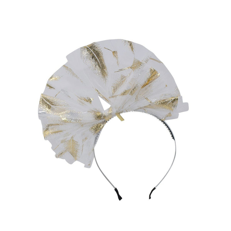 This delicate piece will dress her up in style for all her very special occasions. Lightweight tulle bow is adorned with an elegant gilded feather print, the perfect hair accessory for weddings.Ornament is affixed off-center to a satin-covered metal headband with rubber teeth.