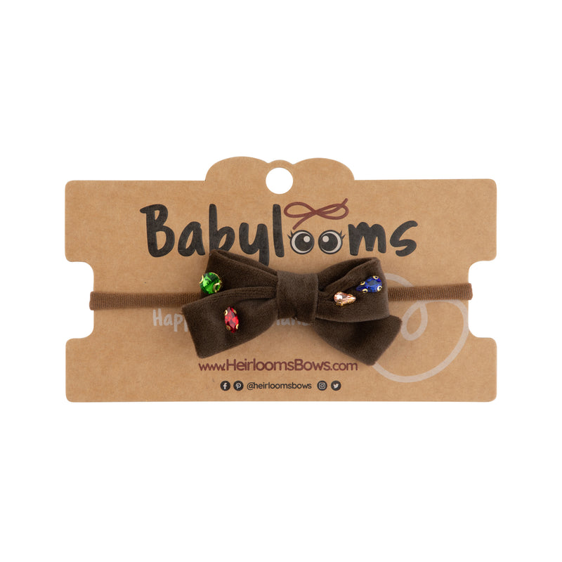 smooth velvet fabric formed into a perfect mini bow with small colored gems attached to a soft rubber for the ultimate baby holiday look.