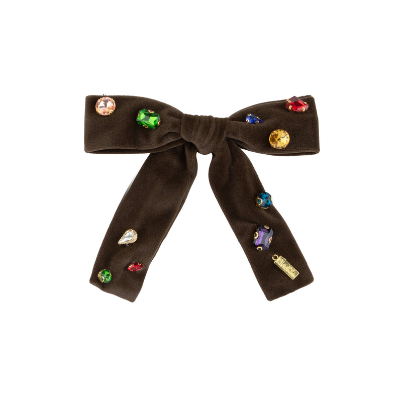 take a note from royalty. smooth velvet fabric formed into a perfect bow with colored gems for the the perfect holiday statement accessory. bow is attached to an alligator clip