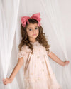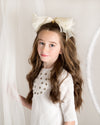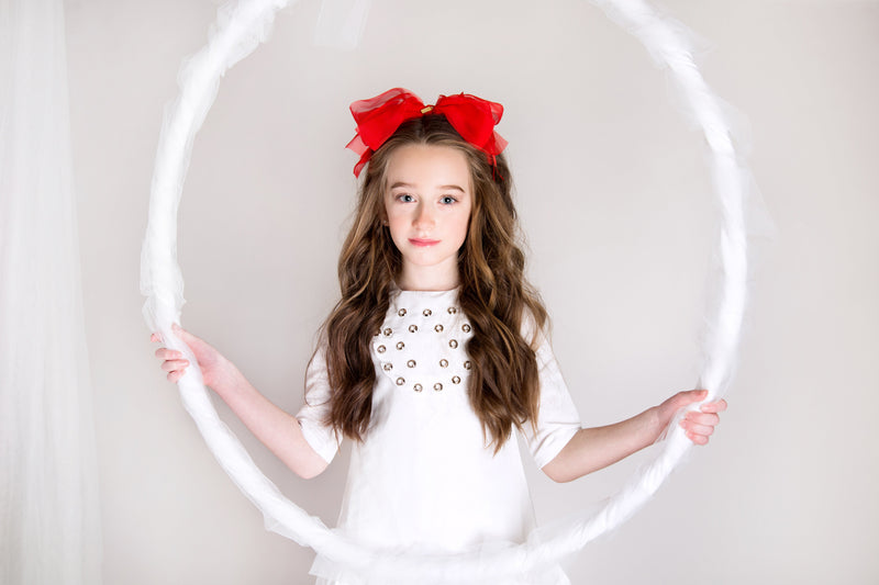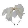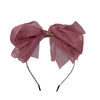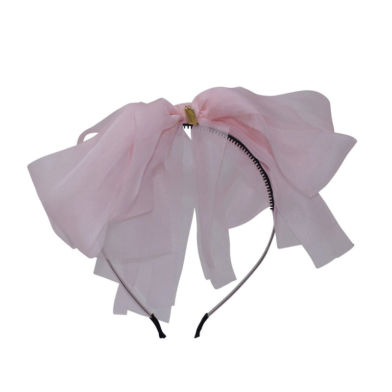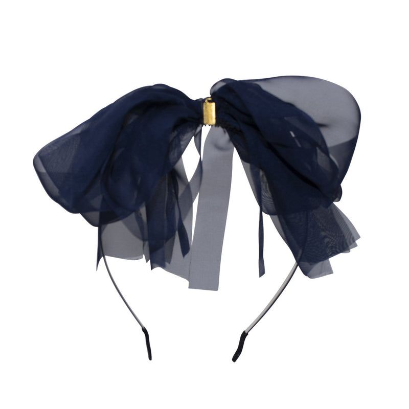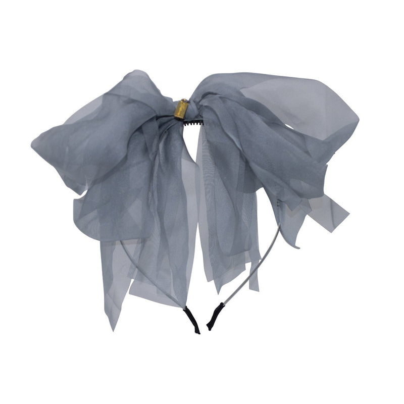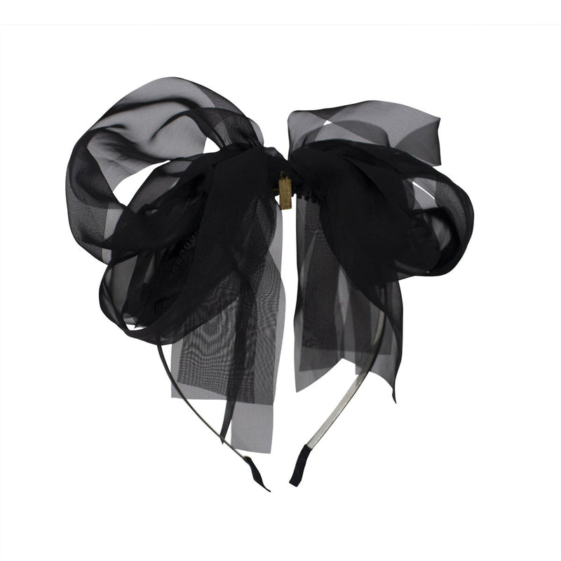 The sheer beauty of this bow is nothing short of special. The layers fall in graceful waves because it is made with four different widths of silk chiffon. This bow is sure to be the crowning touch to her holiday ensemble. Bow is arranged in the center of a satin-covered metal headband with rubber teeth.