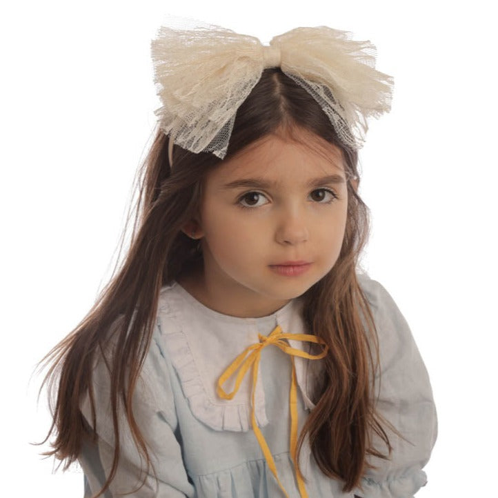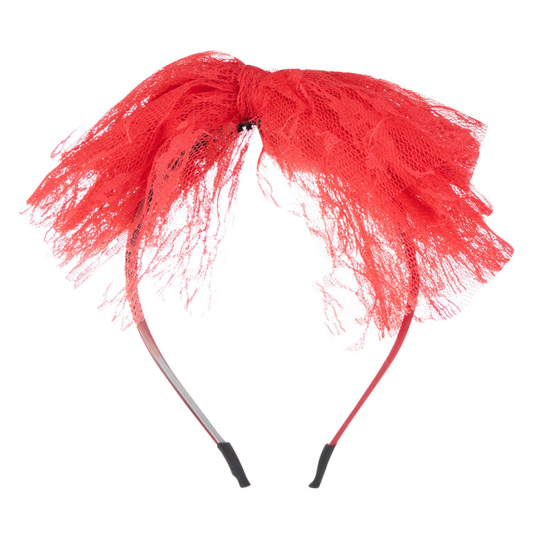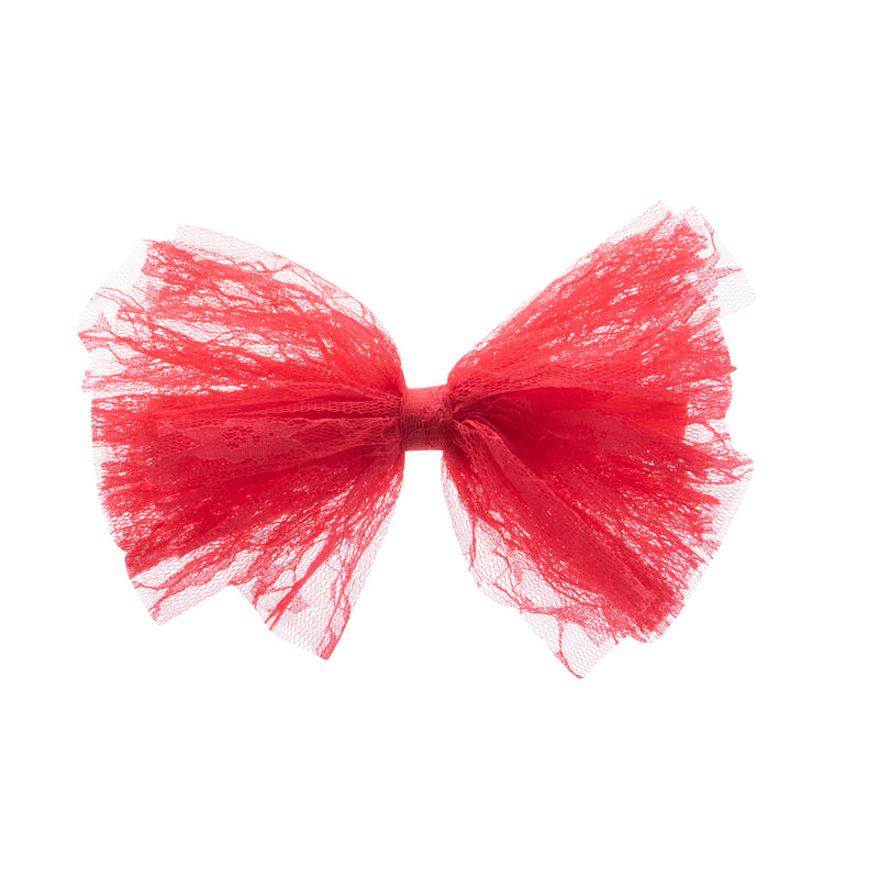 Multiple layers of dainty soft lace make up this trendy bow, Attached to a Fabric covered headband with teeth. Perfect for any special occasion.
