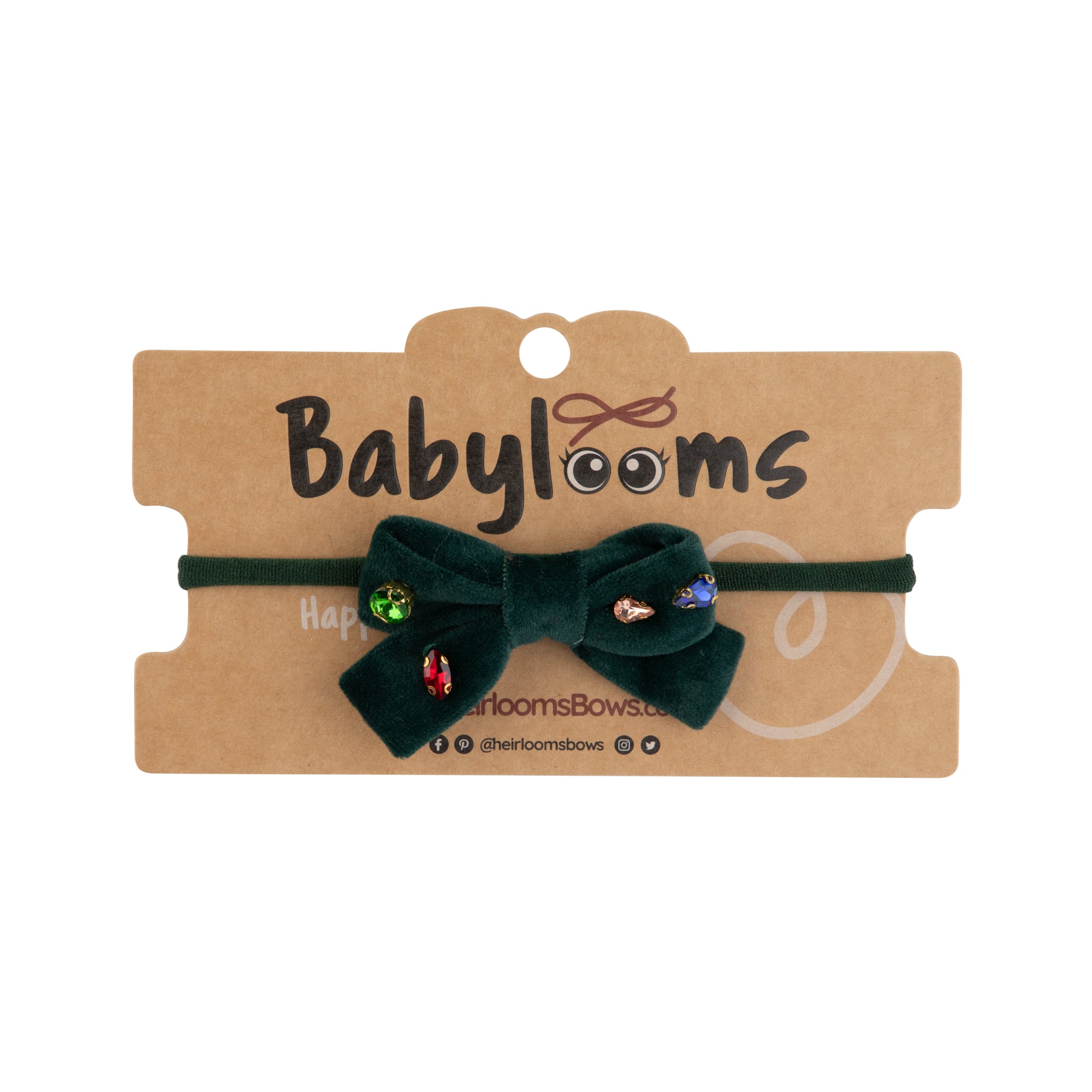 smooth velvet fabric formed into a perfect mini bow with small colored gems attached to a soft rubber for the ultimate baby holiday look.