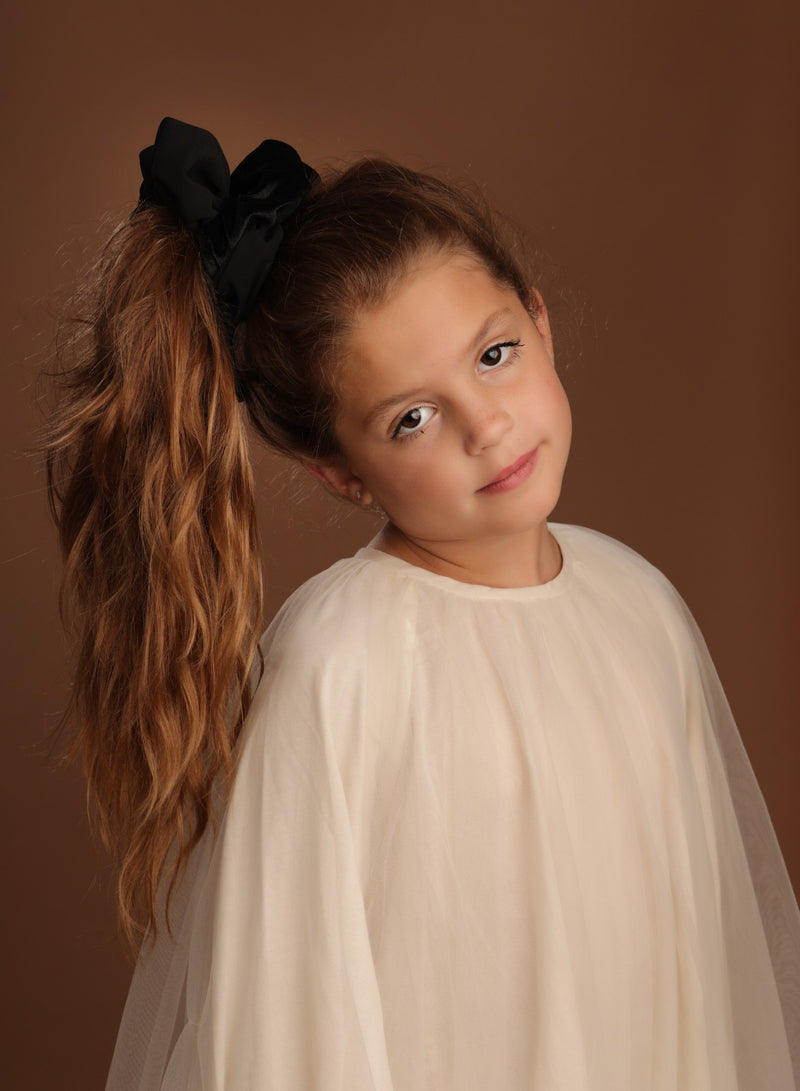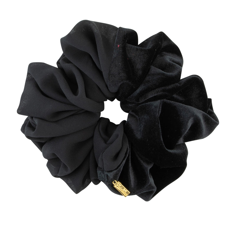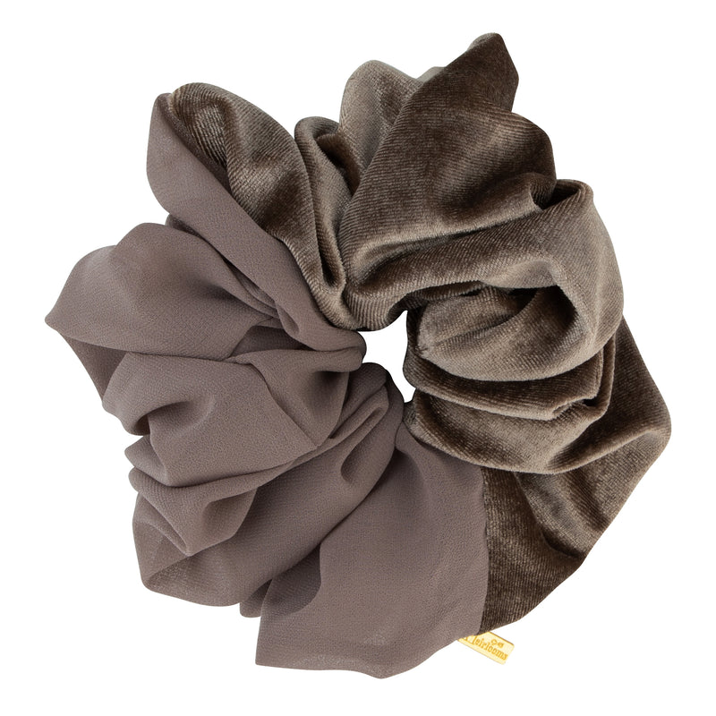 This unique scrunchie offers the best of both worlds. Made half velvet, half chiffon, you have wintry softness and classic elegance all combined into one stunning piece. The oversized scrunchie style falls in graceful folds for a luxurious look. One size fits all.