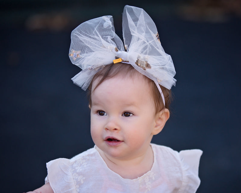 This beauty is made of a soft, airy tulle with an intricate star sequined pattern over it. With its own innate beauty, this piece is a guaranteed showstopper at all baby's weddings and elegant occasions. Bow is attached to a soft, comfy-stretch baby band.