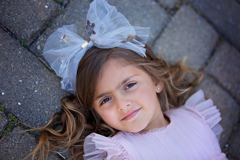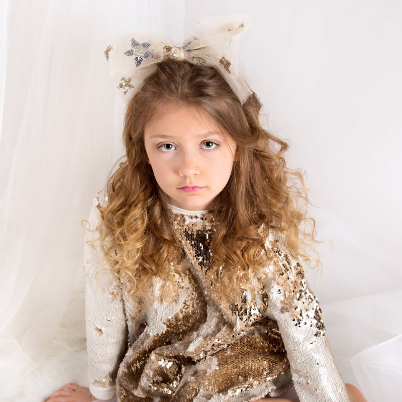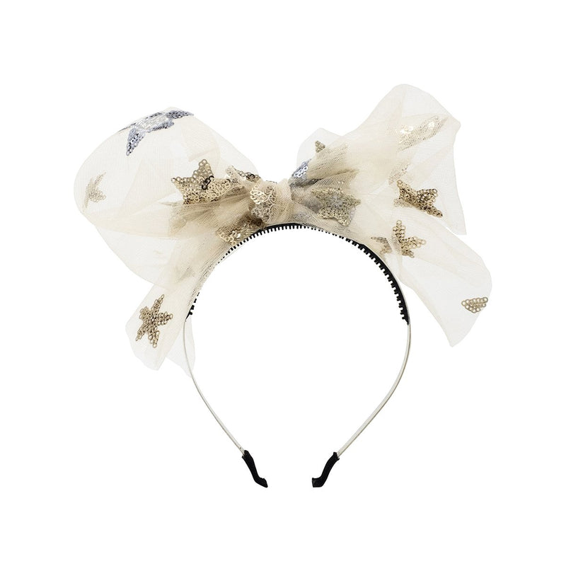 This beauty is made of a soft, airy tulle with an intricate star sequined pattern over it. With its own innate beauty, this piece is a guaranteed showstopper at all her weddings and elegant occasions. Bow is arranged off-center of a satin-covered metal headband with rubber teeth.