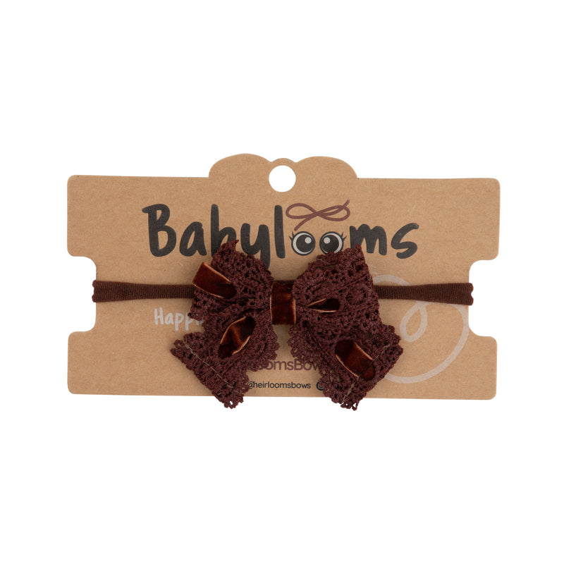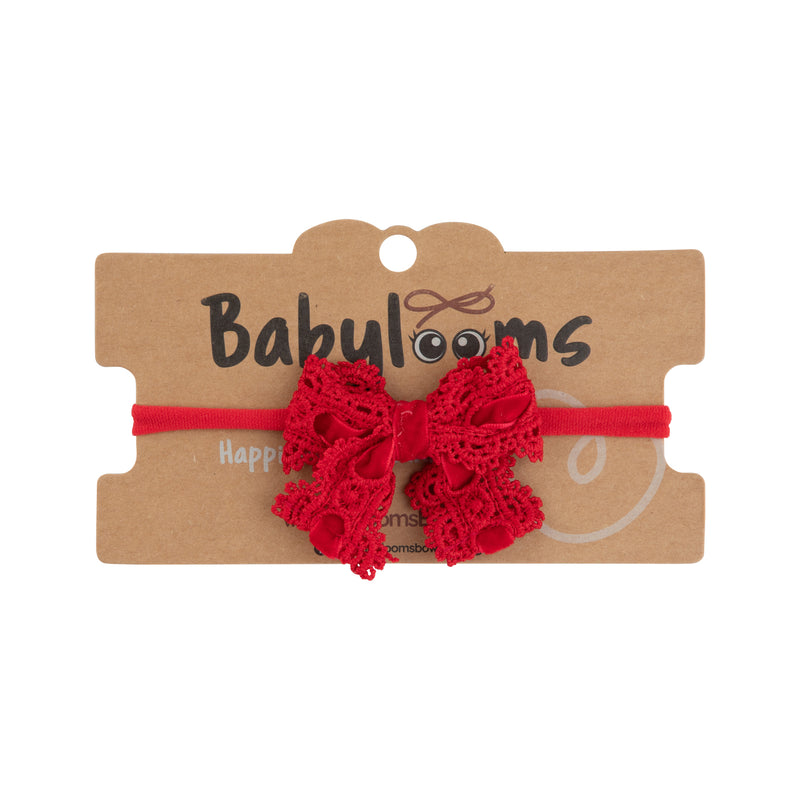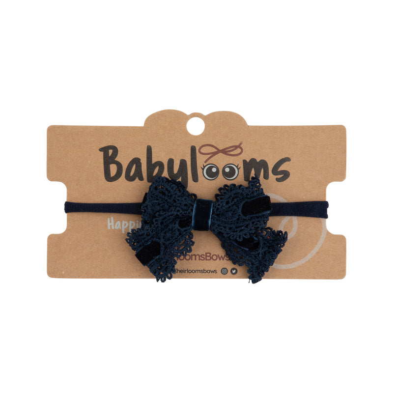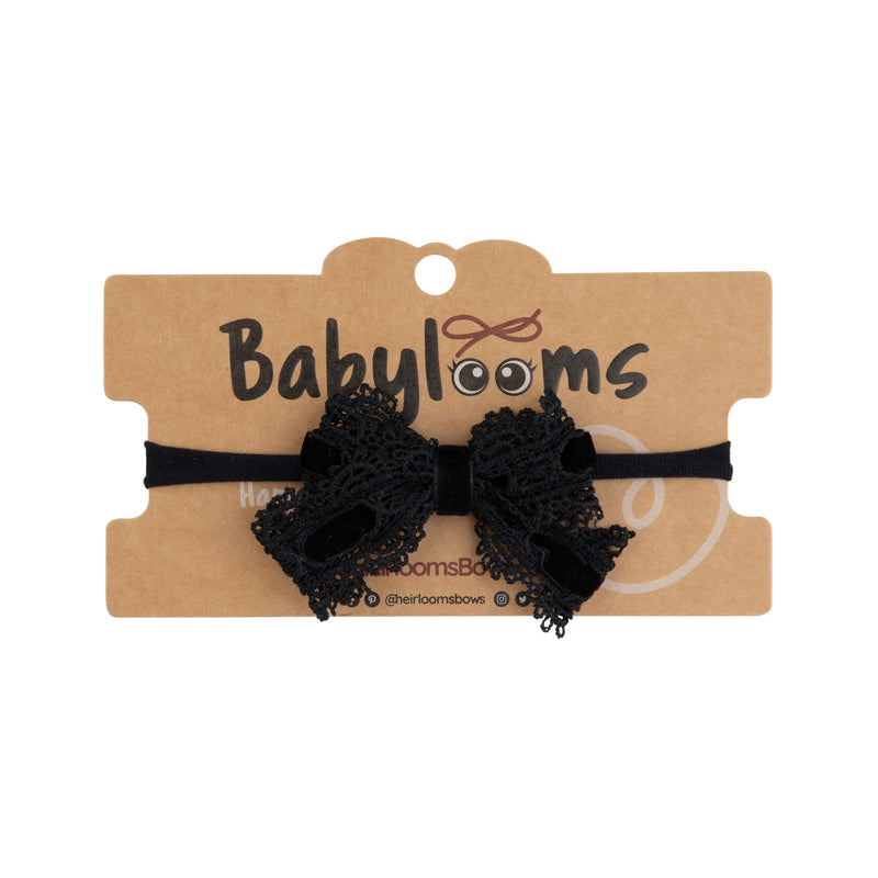 Timeless lace combined with luxurious velvet ribbon tied into a bow, attached to a comfortable rubber for a great fit for your baby.